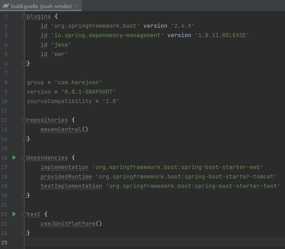 생성된 Spring Boot 프로젝트의 build.gradle을 보시면 아래처럼 기본 내용이 생성되어 있을거예요.