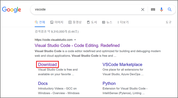 Google 검색창 -> vscode 검색 -> Download 클릭.