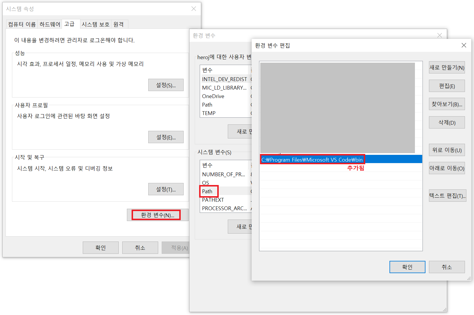 설치가 완료되면 환경변수가 자동으로 등록됩니다.
