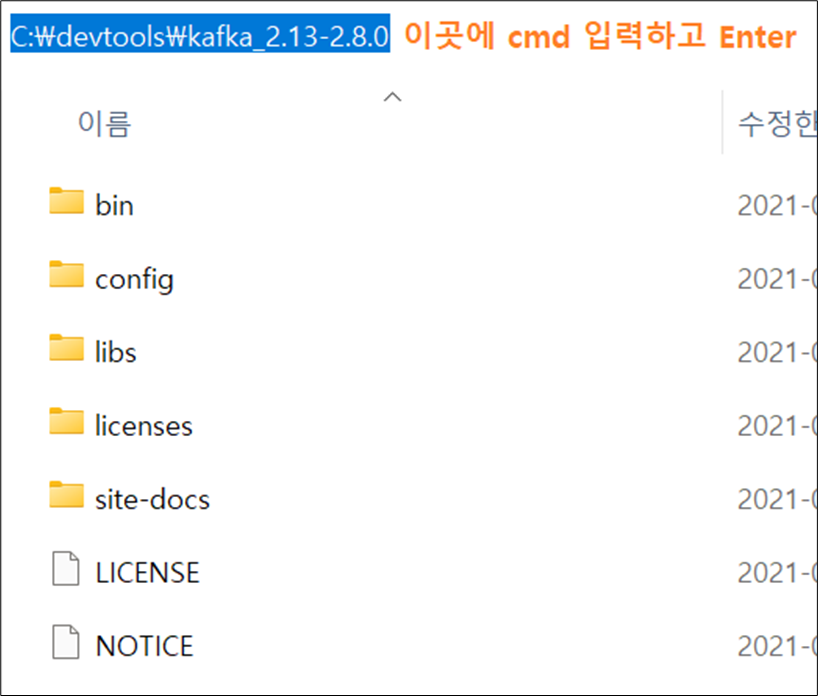 kafka_2.13-2.8.0 폴더 위치에서 cmd창을 띄워줍니다.