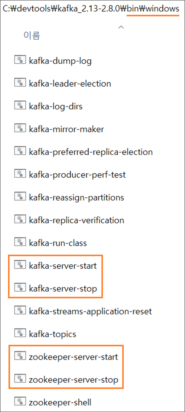 1) kafka_2.13-2.8.0/bin/windows 안에는 아래와 같이 zookeeper와 kafka를 start, stop 시킬 수 있는 파일들이 들어 있습니다.