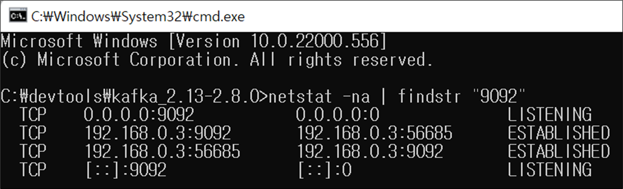 # windows에서 9092포트가 실행되었는지 확인