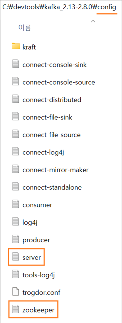 2) {kafka 폴더}/config: zookeeper, kafka config파일 들어있습니다.