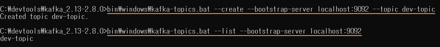 bin\windows\kafka-topics.bat --create --bootstrap-server localhost:9092 --topic dev-topic