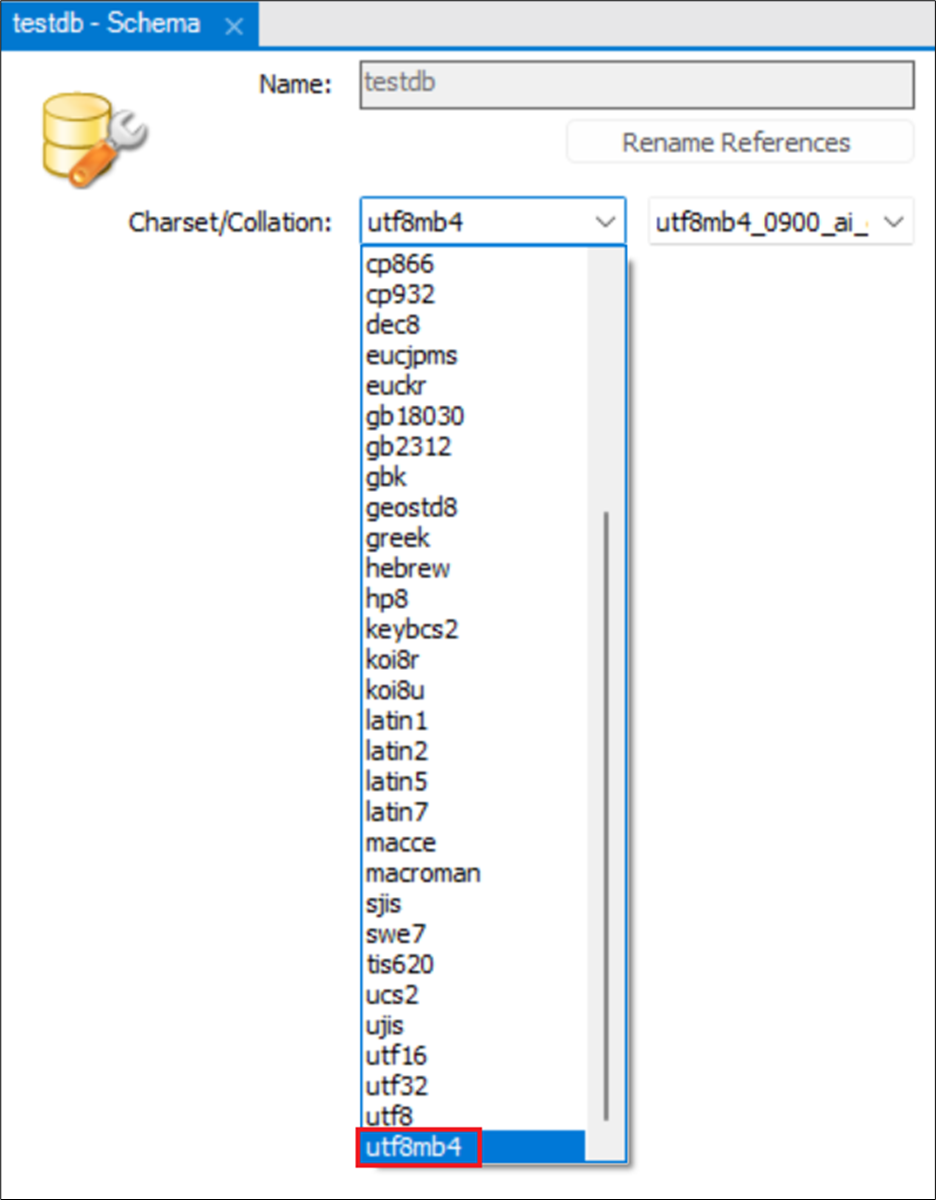 ALTER DATABASE testdb DEFAULT CHARACTER SET utf8mb4;