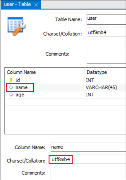 ALTER TABLE testdb.user MODIFY name VARCHAR(45) CHARACTER SET utf8mb4 NULL;