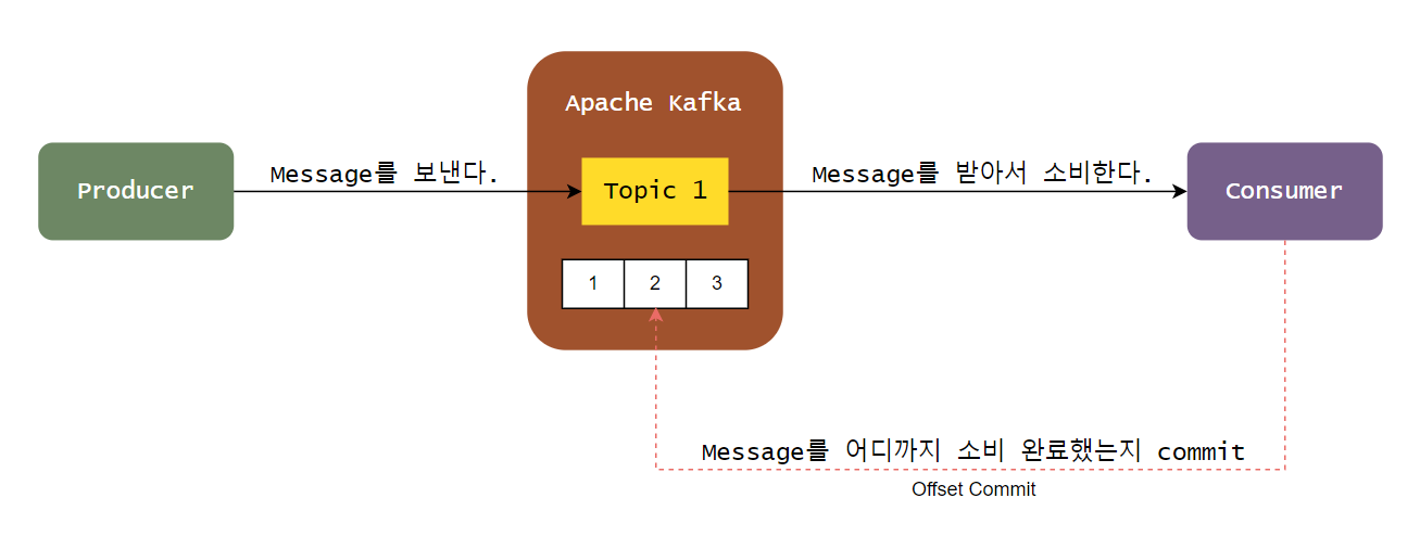 * Offset: Kafka Message의 고유번호. consumer에서 메시지를 어디까지 읽었는지 확인하는 용도로 쓰임