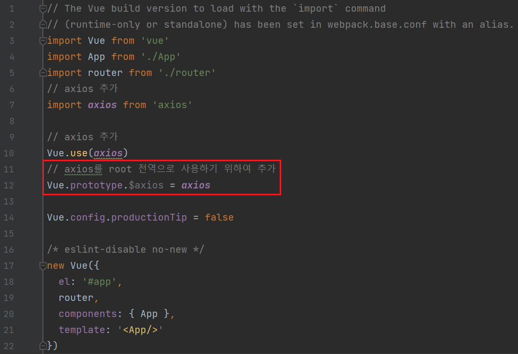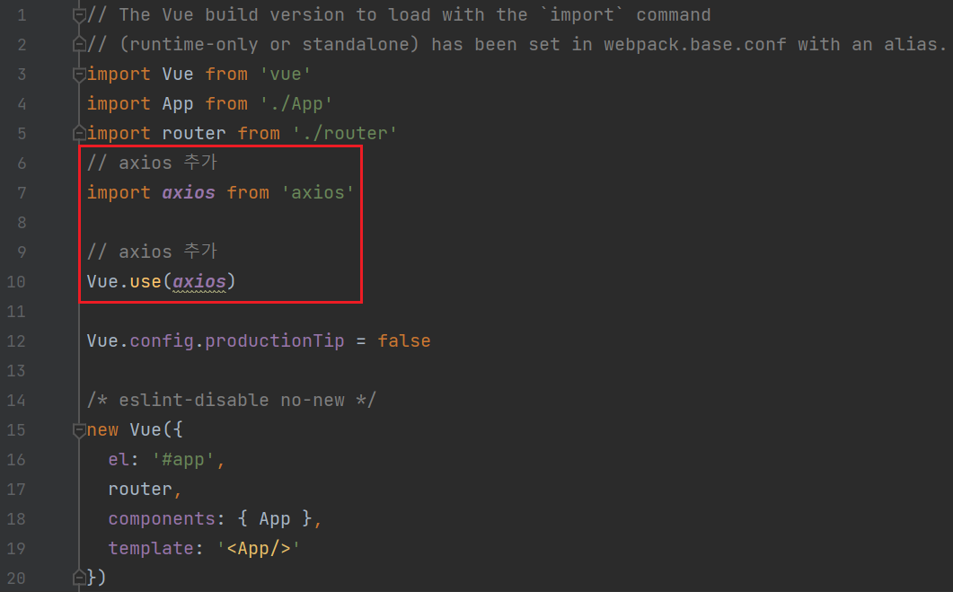 2. vue 프로젝트에서 axios를 사용하기 위하여 main.js에 axios import하기