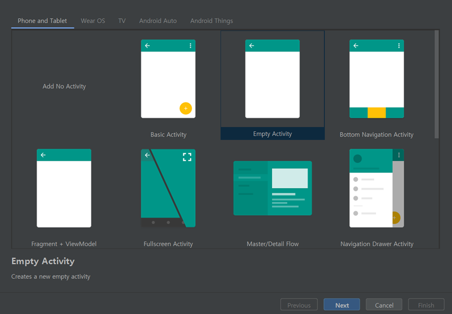 2) [Phone and Tablet - Empty Activity] 선택 후 Next