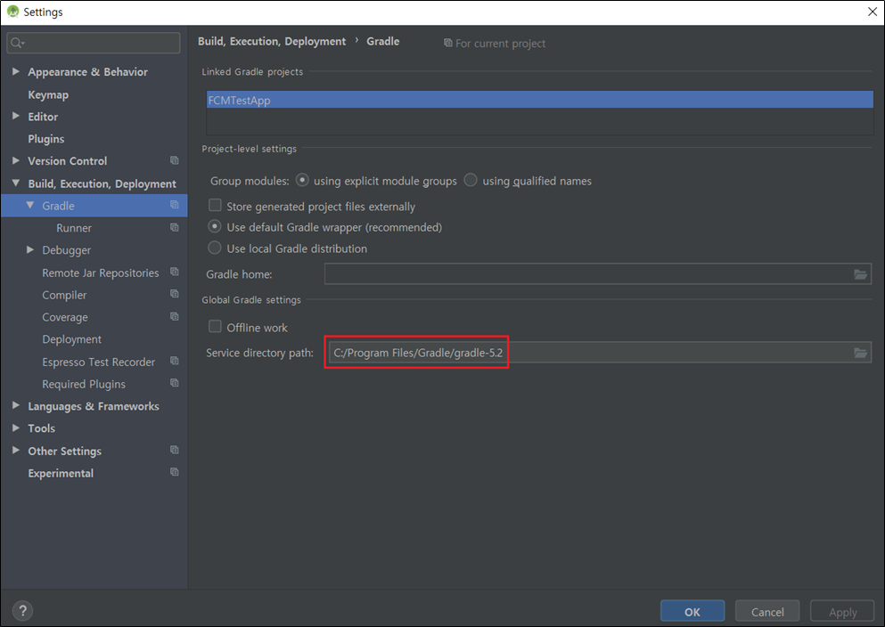 2) [Build, Execution, Deployment - Gradle - Service directory path]에 로컬에 있는 Gradle폴더 위치를 지정합니다.