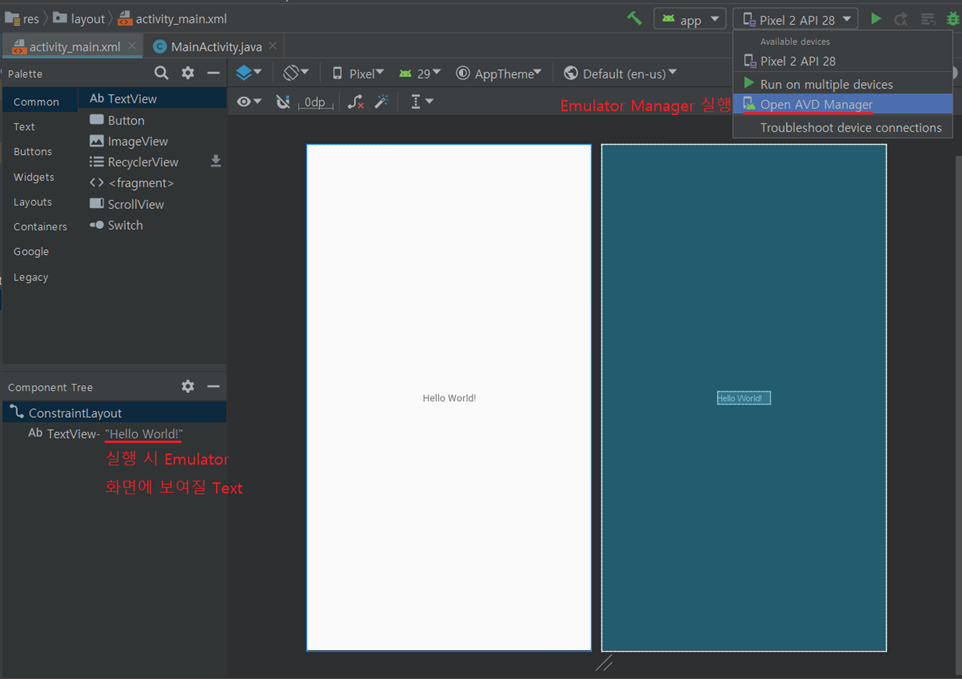 2) 실행 시 보여질 텍스트를 확인 후 - Open AVD Manager로 이동합니다.