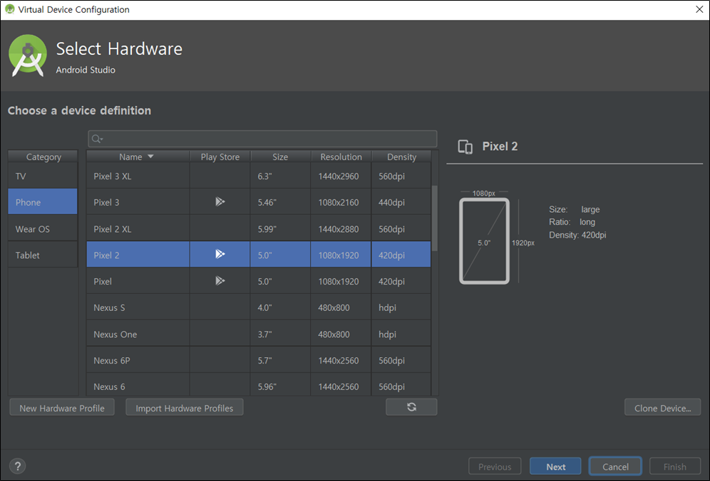 <Android Studio 환경 셋업 - AVD Manager의 Device 셋업>