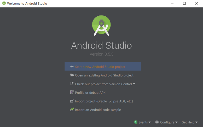 1) Android Studio 설치 후 실행화면에서 [Start a new Android Studio project]를 선택합니다.