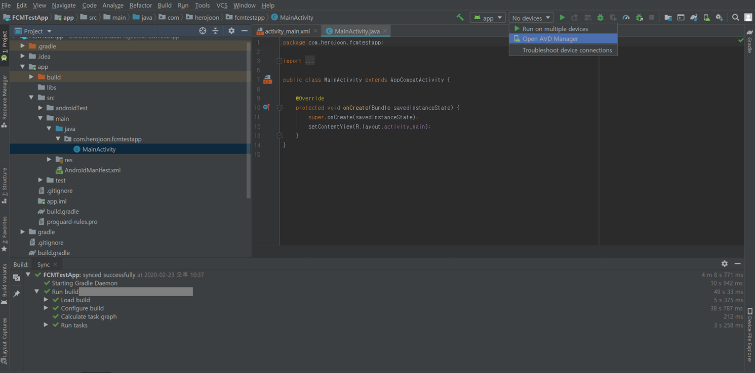 - 생성한 프로젝트를 Android 애뮬레이터로 띄워보기