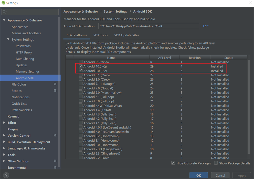 3) [Appearance & Behavior - System Settings - Android SDK - SDK Platforms Tab]에서 원하는 Android Version에 맞춰 SDK를 Download합니다.