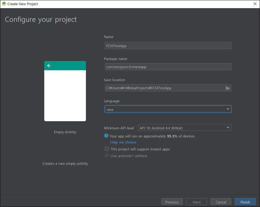 3. FCM App 프로젝트 생성 (Receiver)