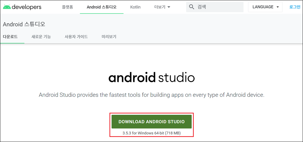 1) Android Studio를 다운로드 받습니다. (별도의 회원가입이나 로그인 없이 설치 가능합니다.)
