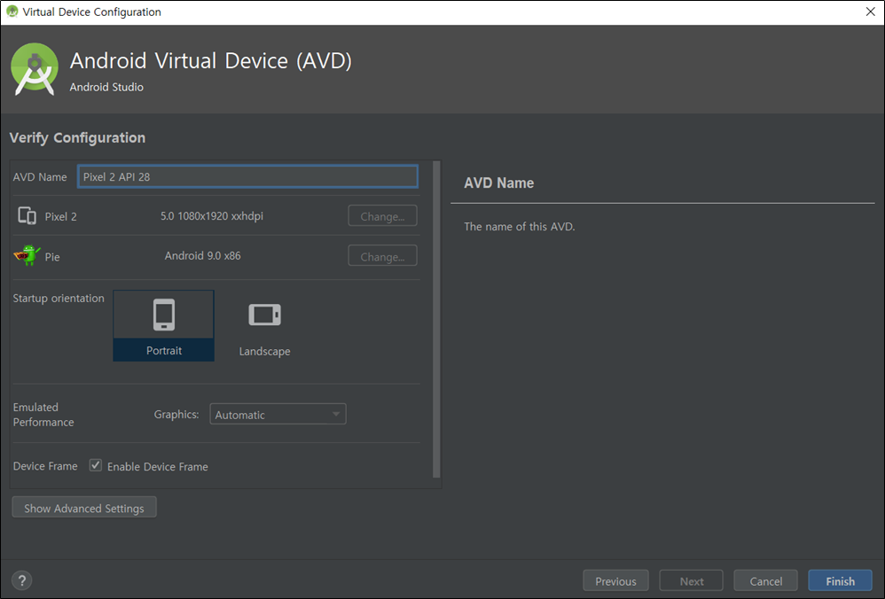 8) 원하는 AVD Name 입력 후 Finish