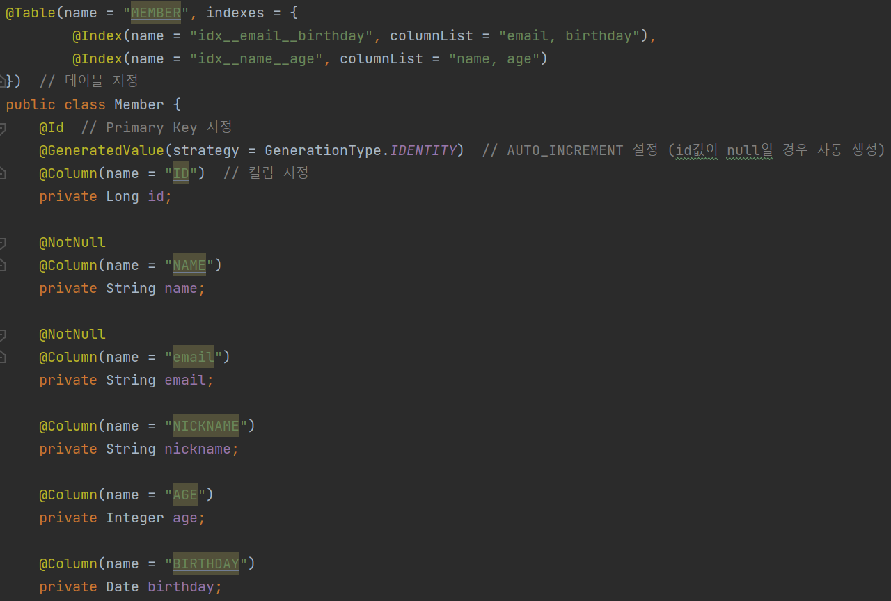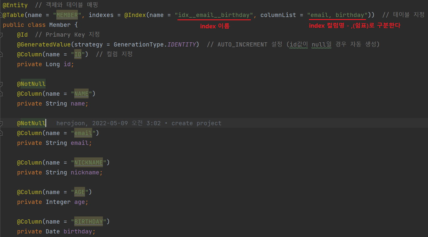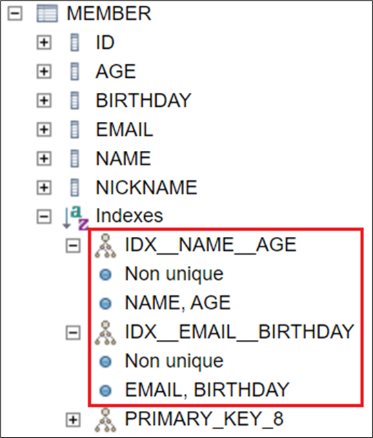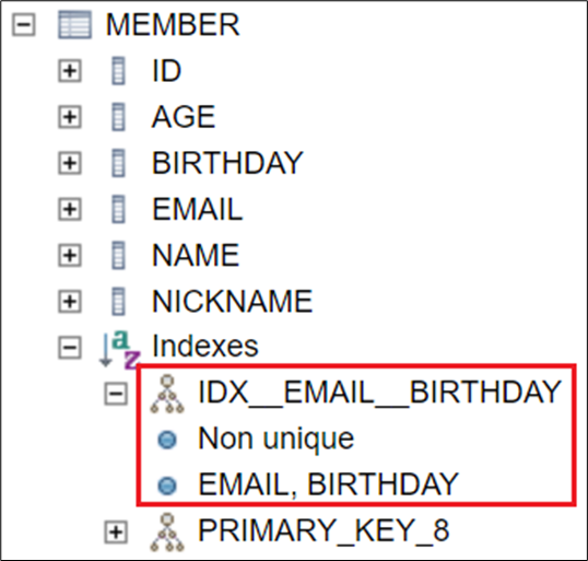@Table(name = "MEMBER", indexes = @Index(name = "idx__email__birthday", columnList = "email, birthday"))