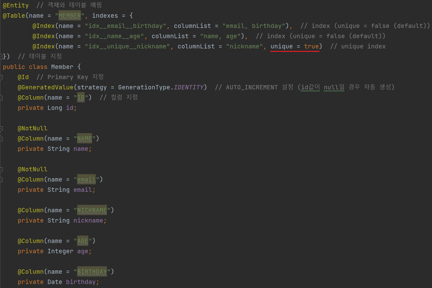 unique = true 옵션을 넣어주면 Unique Index로 생성된다.