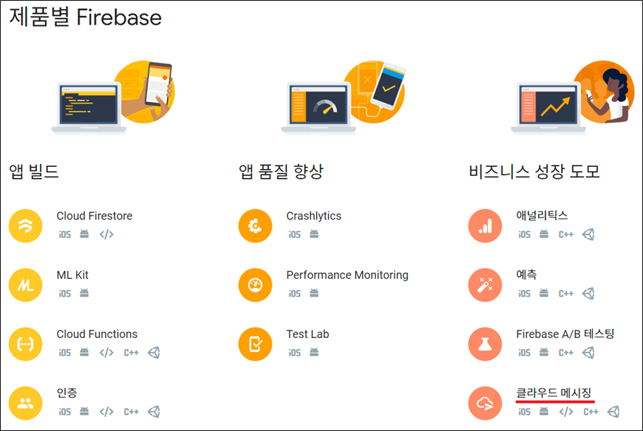 이동한 화면 아래 [제품별 Firebase - 클라우드 메시징]으로 이동합니다.