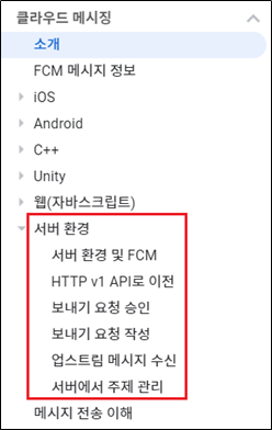 왼쪽 메뉴에서 [클라우드 메시징 - 서버 환경]을 보시면 FCM Push를 전송하기 위한 가이드가 자세히 작성되어 있습니다.