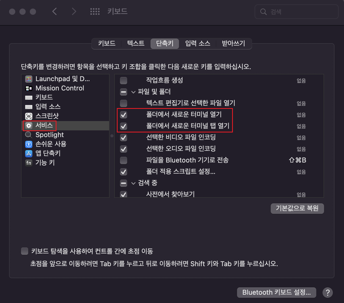 서비스 - 폴더에서 새로운 터미널 탭 열기 체크