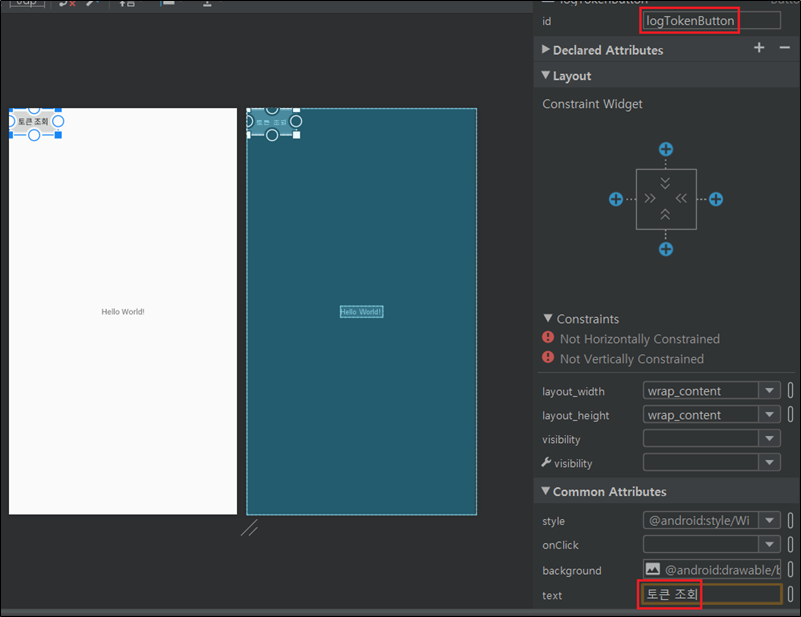 Button을 그려주어야 하는데요. MainActivity에 연결된 layout파일에 logTokenButton을 그려줍니다.