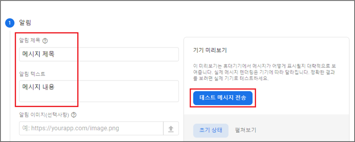 메시지 전송은 Firebase Console에서 테스트메시지를 보낼 수 있습니다.