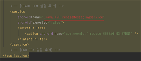 <FCM Push를 받기 위한 앱 설정 - AndroidManifest 추가>