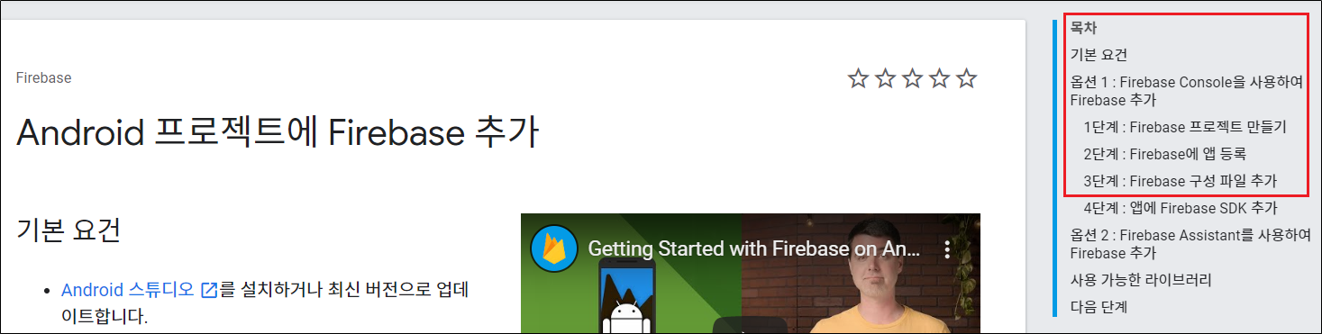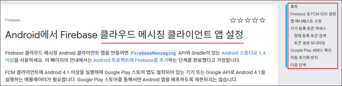 3) 오른쪽 목차를 보면 Firebase 설정 가이드가 친절하게 제공됩니다.