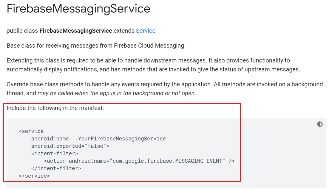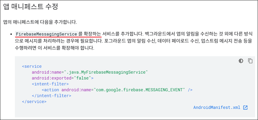 위 FirebaseMessagingService의 상세를 들어가보니 아래와 같이 manifest를 작성하라고 하네요.