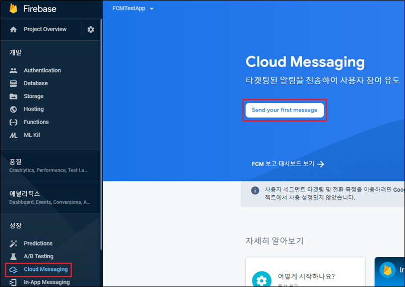 FCM(Firebase Cloud Messaging)을 사용할거니까 클라우드 메시징을 선택해주세요.