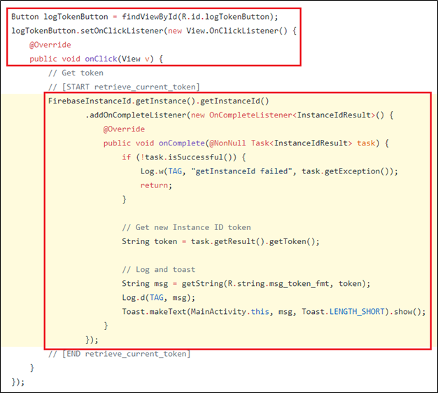 저 logTokenButton을 앱에서 터치(클릭)하는 순간 토큰 조회 코드가 수행되며 값을 가져오게 됩니다.