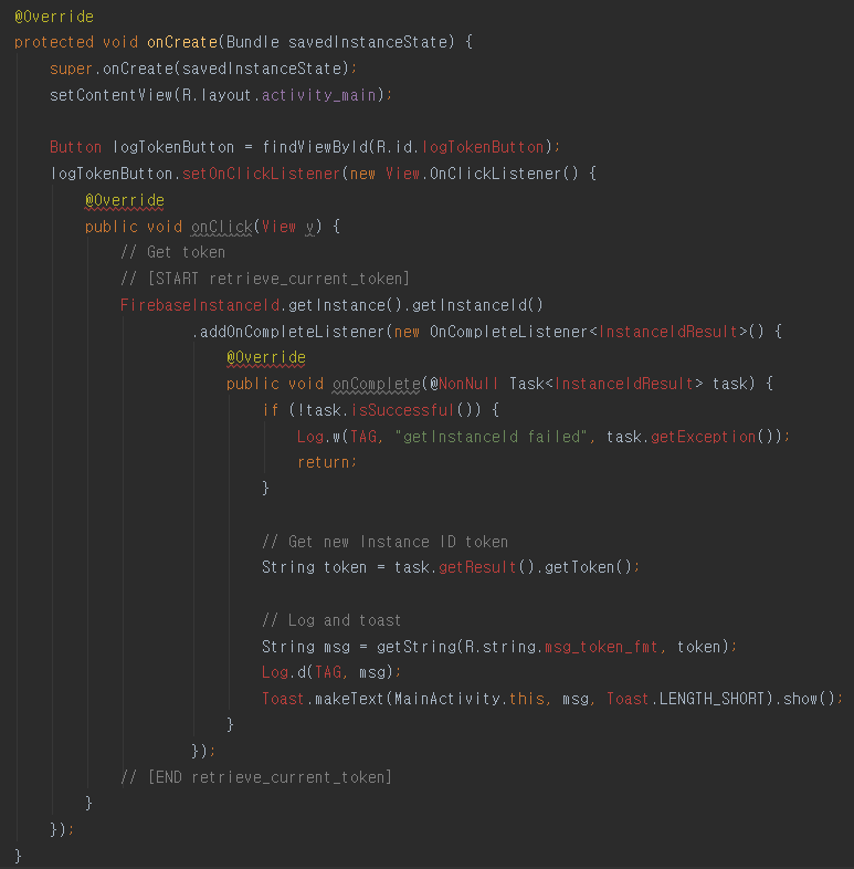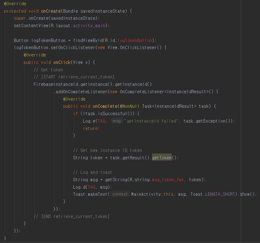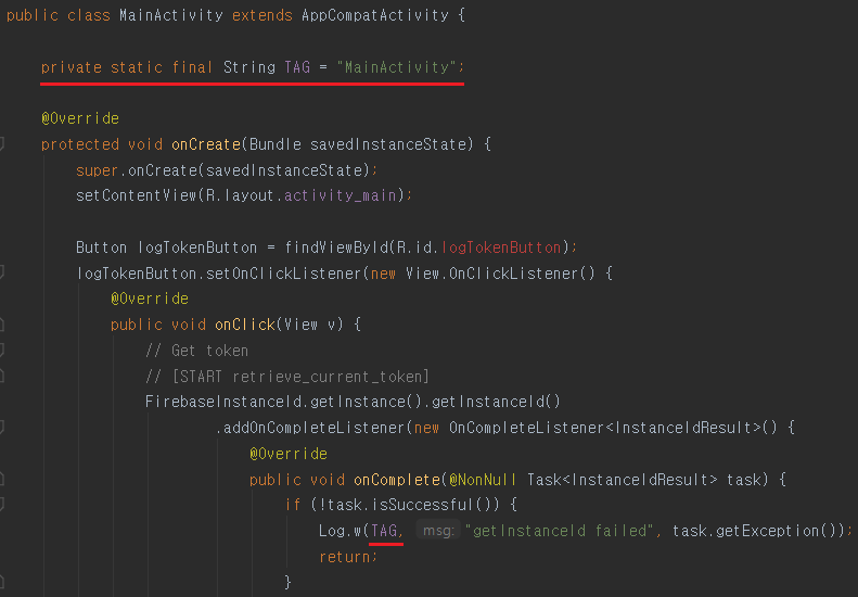 MainActivity.java파일에서 logTokenButton에 빨간색이 없어진 걸 확인 할 수 있습니다.