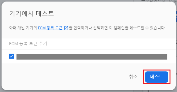 추가한 토큰 정보를 선택후 테스트 버튼을 눌러 Push를 전송합니다.