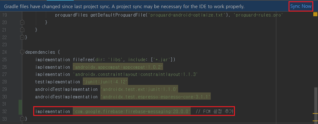 - 위치 : FCMTestApp프로젝트 / app / build.gradle