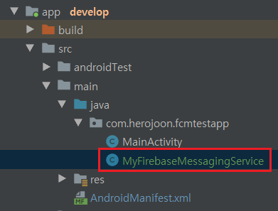MyFirebaseMessagingService.java파일을 App위치 패키지 아래 생성해주었기 때문에