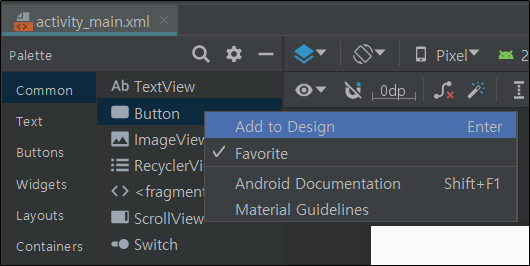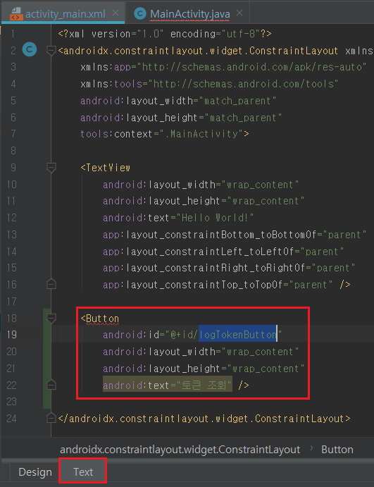 activity_main.xml화면에서 Text탭에서 버튼이 생성된 것을 확인 할 수 있습니다.