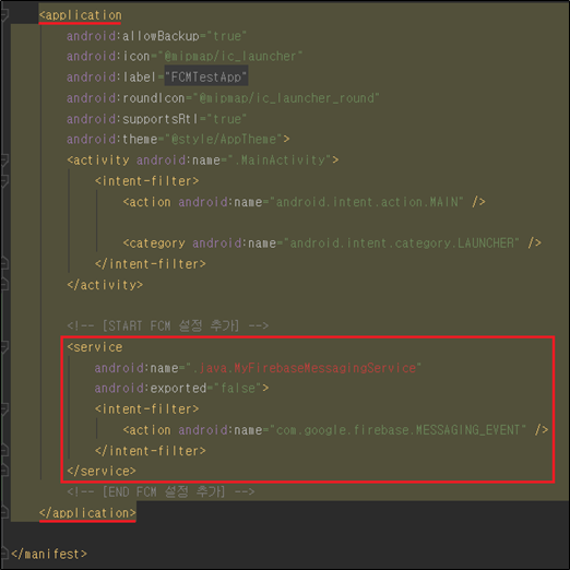 - 위치 : FCMTestApp프로젝트 / app / src / main / AndroidManifest.xml