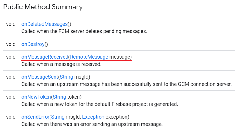 FirebaseMessagingService에서 제공하는 메소드를 살펴보면 onMessageReceived()가 메시지를 수신받아주네요.