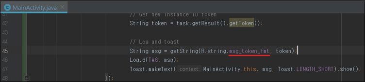 MainActivity.java파일에서 msg_token_fmt에 빨간색이 없어진 걸 확인 할 수 있습니다.