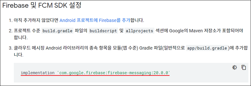 - Firebase에서 제공하는 Cloud Messaging Library 추가