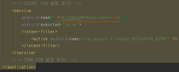2) FCM AndroidManifest 설정에 클래스 연결