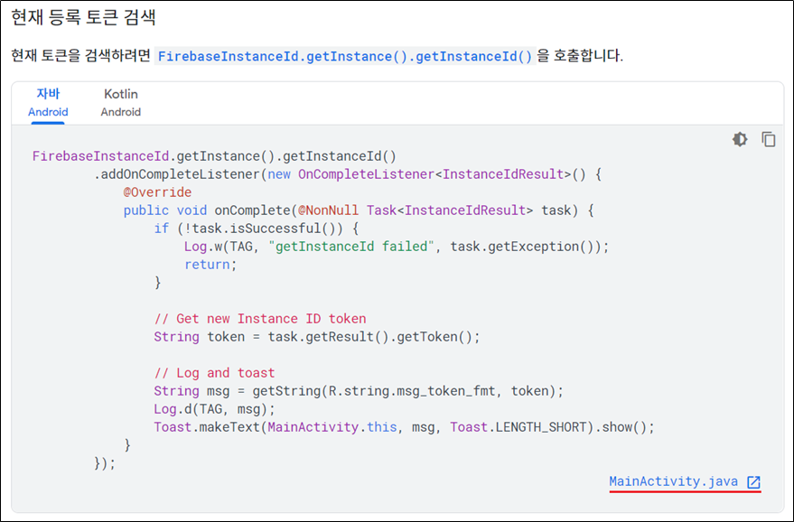 위에서 이동한 [클라우드 메시징] 개발 가이드 문서를 참고하여 토큰 조회 코드를 추가해보겠습니다.