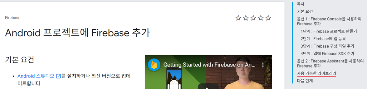 [사용 가능한 라이브러리]에서는 Firebase에서 제공하는 기능의 목록들을 볼 수 있습니다.