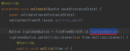 코드에 findBiewById(R.id.logTokenButton)이라고 되어 있죠. view에서 저 id를 찾나봐요.