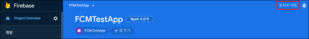 1) [Firebase Console - 프로젝트 선택(ex. FCMTestApp) - 문서로 이동] 순으로 이동합니다.