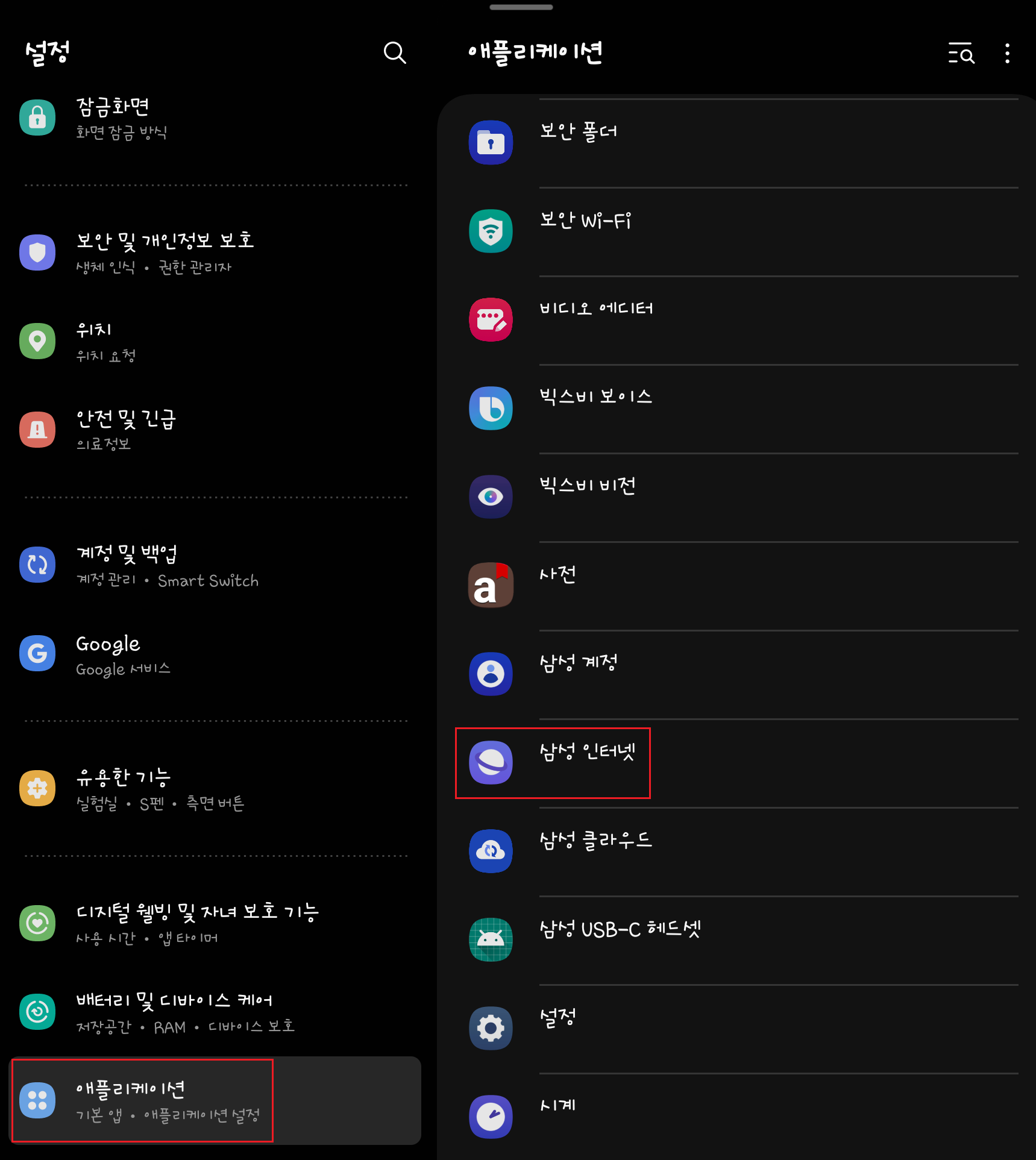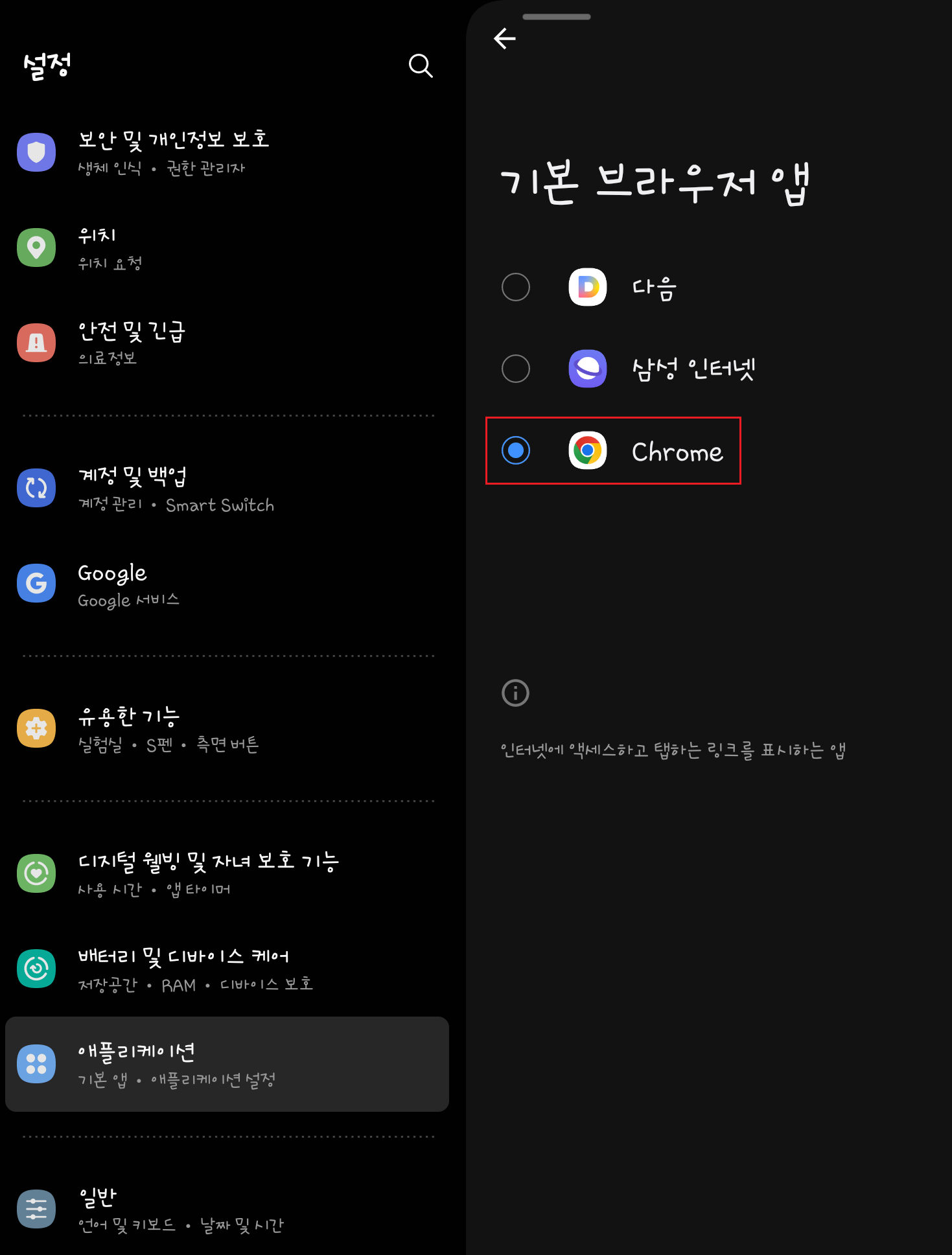 설정 -> 애플리케이션 -> 삼성 인터넷 -> 브라우저 앱을 Chrome으로 변경해줍니다.