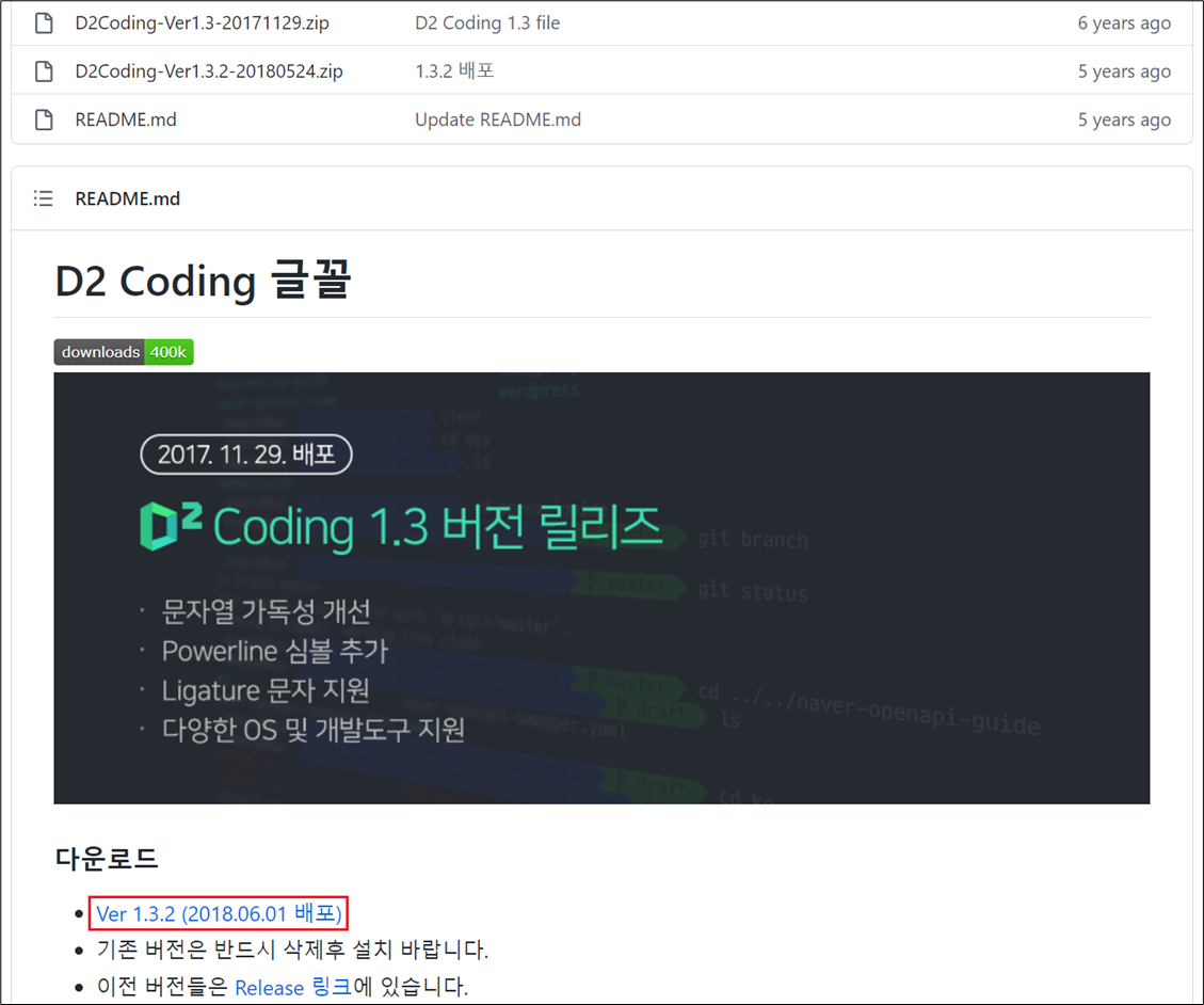 D2Coding-Ver1.3.2-20180524.zip 압축파일을 다운로드 합니다.